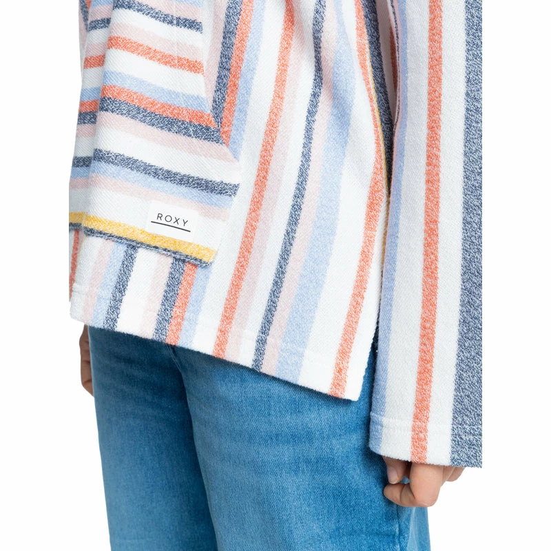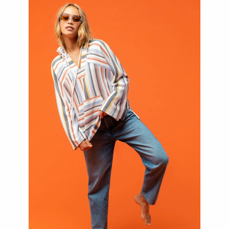 Feel young, wild, and free in this beautifully striped poncho hoodie. The cozy cotton polyester blend fabric offers a comfy relaxed fit complete with exaggerated raglan sleeves, a kangaroo pouch pocket, and trendy side slits.