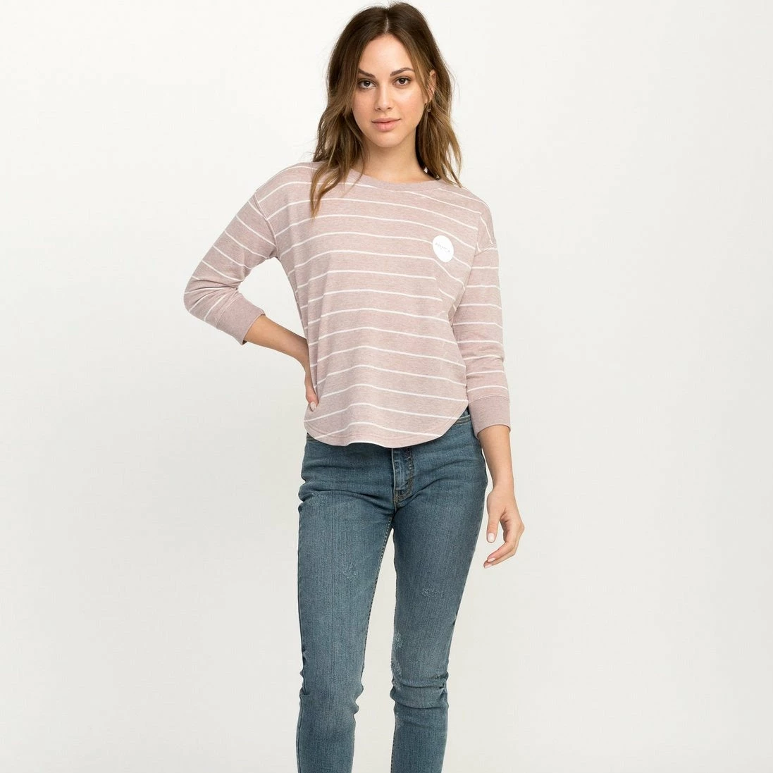 Move Your Essential Crewneck Fleece Forward With Thw RVCA Motors Striped Pullover Crew Sweatshirt. Featuring Freshly Printed Stripes Throughout And A RVCA Logo At The Chest., The Women’s Fleece Updates A Classic Crewneck Pullover With A Rounded Hemline.